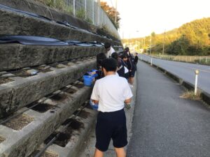 今回は県道沿いの花壇の土づくりを行い、60名近い生徒が参加しました。