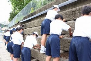 放課後にボランティア活動で、県道沿いの花壇にひまわりを植えるための準備をしました。