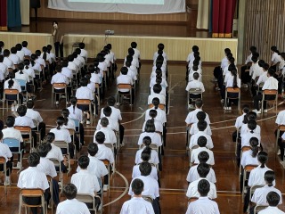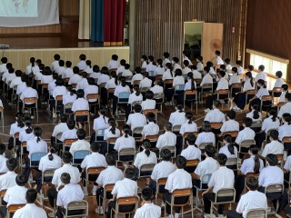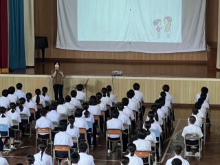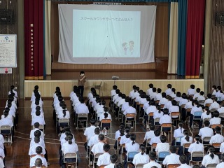 7月14日㈭、GHP(思春期グローイング・ハート・プロジェクト)の一環として、スクールカウンセラーの長井 朋先生による授業がありました。筋弛緩法の実践もありました。一度、力を入れてから静かに力を抜くと効果的に脱力することができるそうです。心身共に健康に過ごすために、普段から「相談」することも大切であるとわかりました。「相談」は心の弱い人がすることではなく、どんな立場の人でも必要だと話されたことがとても印象的でした。自分のつらさをだれにも伝えられない場合もあるため、周囲の人が気付くようにしたい、とも話されました。是非、ご家庭でも話し合っていただきたい内容の学習でした。