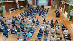2月10日(金)来年度入学予定の6年生と保護者をお迎えして、入学説明会が行われました。5校時には1.2年生の授業を見学し学習についての話を聞きました。6校時は1年生恒例の『島中アピール』を行いました。委員会活動、学校行事、人間関係についてなどクイズや寸劇、動画を交えた発表で、楽しく紹介しました。特に集団行動のパフォーマンスでは、大きな拍手が起こっていました。部活動紹介動画、部活動の地域移行について教育委員会からの説明もありました。あいにくの天候でしたが、6年生の皆さんは期待に満ちた表情で話しに聞き入っていました。
