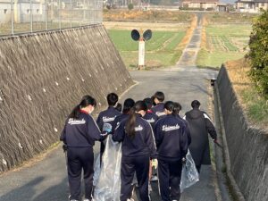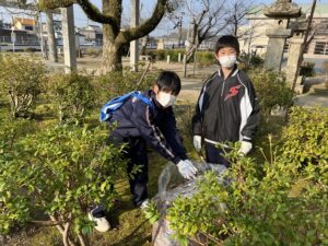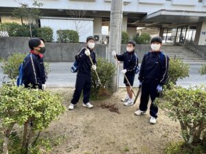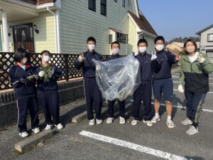 3月11日(土)はピカピカデイでした。普段お世話になっている、島田中学校区10か所の施設周辺のゴミ拾いや草引き、清掃活動を行いました。一見すると、ゴミはないように見えますが、街路樹付近や横断歩道の近く等にはタバコの吸い殻やペットボトル等がたくさん落ちていました。川沿いも思いのほかゴミが散在しています。活動を通して住み易い街づくりには、一人一人責任ある行動を心がけることが大切だということを感じました。地域の方から、「ようやってくれるね。」「ありがとう。」と声を掛けていただき、充実感でいっぱいになりました。参加した生徒たちはとても清々しい気持ちで活動を終えることができました。協力してくださった施設のみなさん、地域のみなさんありがとうございました。