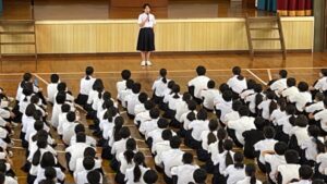 6月1日(木)全校集会が行われました。表彰式後、各委員会から今月の目標と重点項目の発表、生徒会役員からスマイルトークについての話、生徒会長の話がありました。『梅雨に入り、中だるみしやすい時期にあっても、気を引き締めて生活をしよう』や『うっとうしい季節だからこそさわやかなあいさつをしよう』、『定期テスト②への早めの対策を始めよう』等、どの委員会も趣向を凝らした発表内容でした。今年は例年より早い梅雨入りですが、ジメジメをものともしない活気ある集会で、全校生徒が心を一つにしていました。